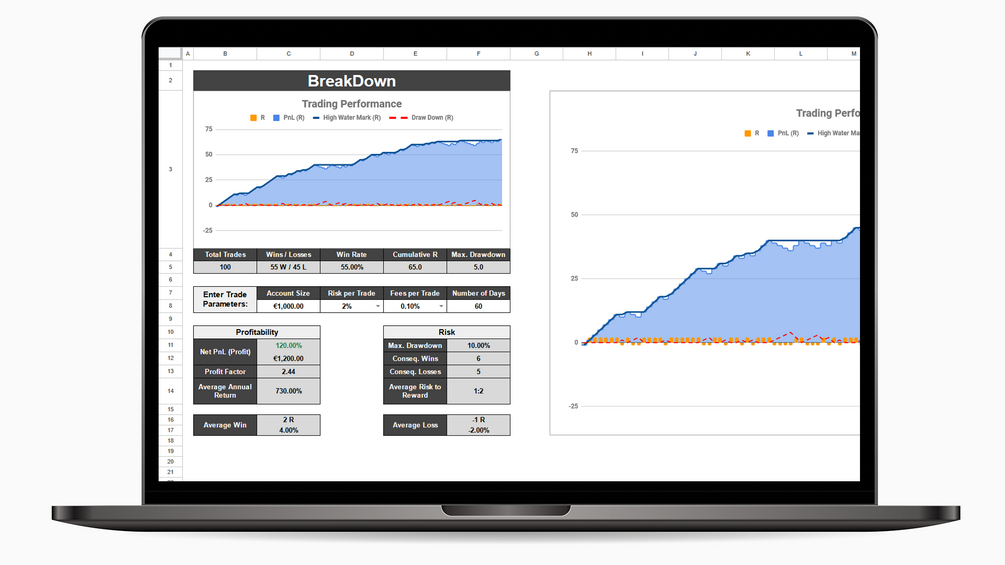 - Tracking: Trage über 100 Trades in Form von "R" in das Spreadsheet ein und erhalte erste Informationen zur Performance, wie Profit (in R), High Water Mark (in R) und Drawdown (in R).