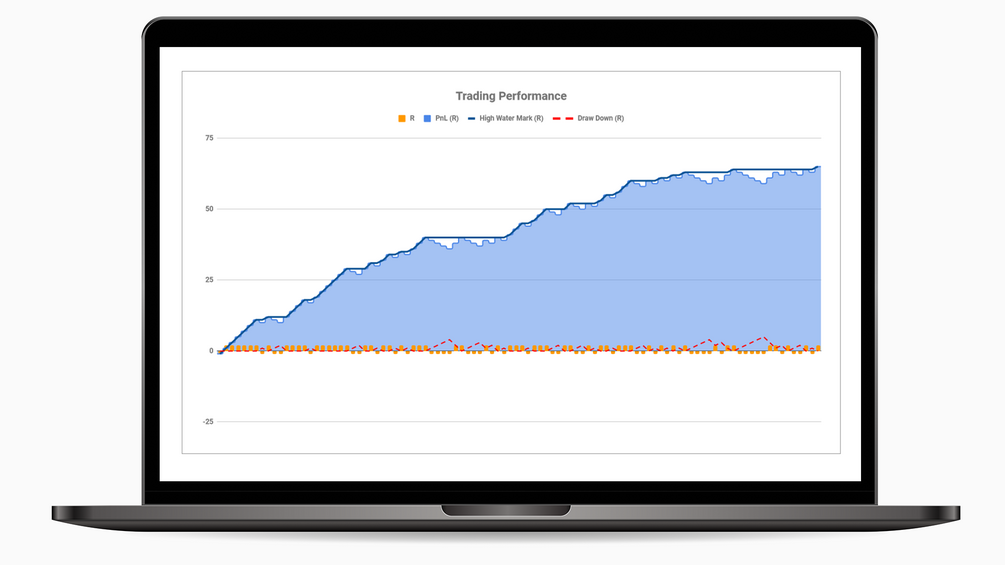 - Trading Performance Chart: Visualize your performance using a chart that clearly shows R, PnL, High Water Mark, and Draw Down.