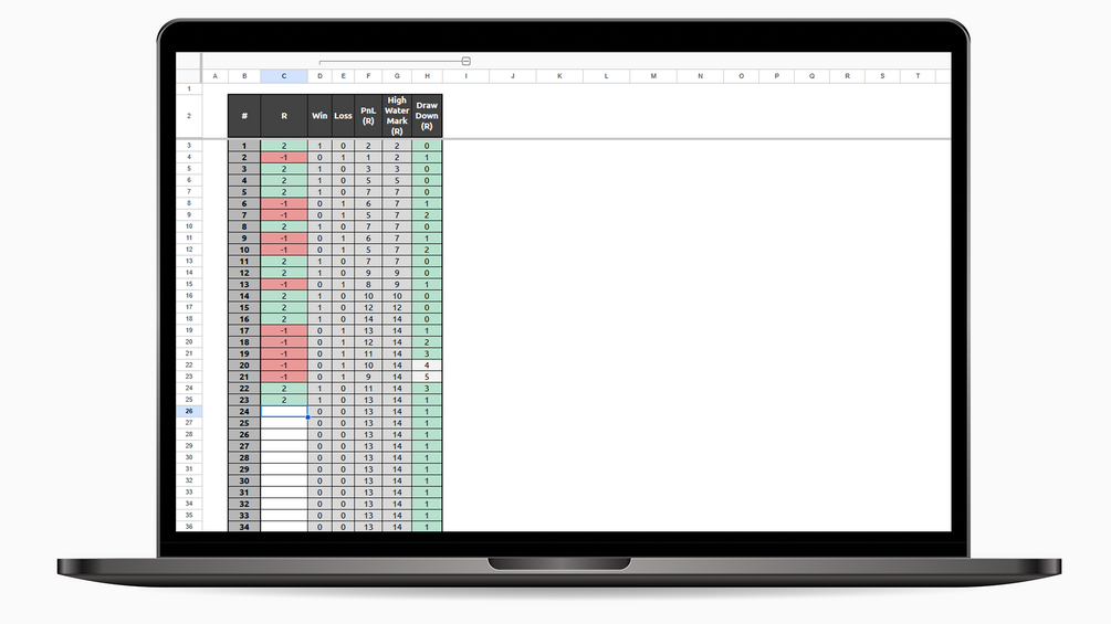 - Tracking: Enter over 100 trades in the form of "R" into the spreadsheet and get initial performance information, such as Profit (in R), High Water Mark (in R), and Drawdown (in R).