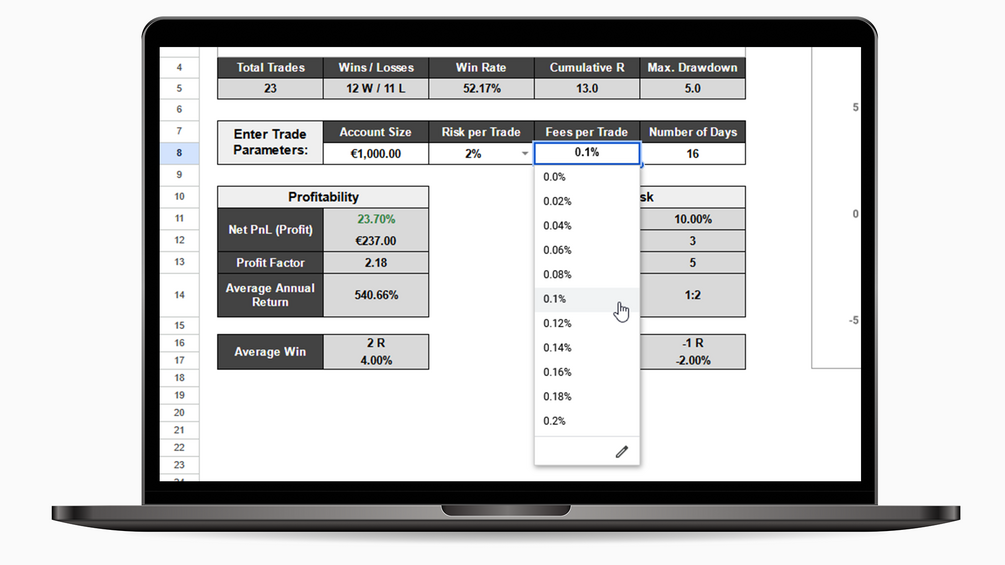 - Detailed Breakdown: Get automated calculations for Net PnL, Profit Factor, Average Annual Return, Max. Drawdown (in %), Conseq. Wins, Conseq. Losses, Average Risk to Reward, Average Win (in R and %), and Average Loss (in R and %).
